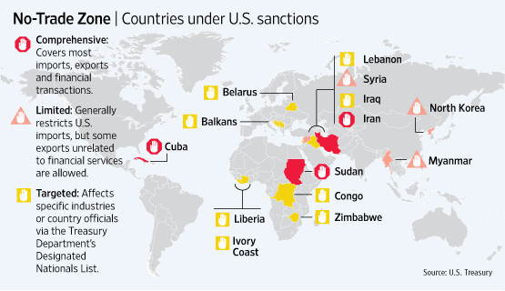 La Oficina de Control de Activos Extranjeros (Office of Foreign Asset Control – OFAC) del Departamento del Tesoro Estadounidense administra y hace cumplir las sanciones económicas y de comercio sobre la base de la política exterior y de seguridad Estadounidense contra los países extranjeros, regímenes totalitarios, terroristas, narcotraficantes internacionales, los que se dedican a la propagación de armas de destrucción masiva y otras amenazas a la seguridad nacional, política exterior o economía de los Estados Unidos. Las sanciones se extienden en grado de objetivo, limitado y comprensivo en su severidad, ilustrado en el siguiente mapa.